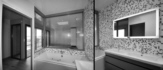 Belles liaisons entre l'intérieur & l'extérieur grâce au dessin des larges baies vitrées & la double paroi murale en verre de la salle de bain. La répartition dynamique des carreaux de pate de verre donne un caractère fort à cette pièce tout à la fois fermée & ouverte. |