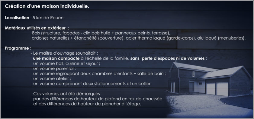 d’une maison à ossature bois avec terrasse à l’étage et avancée de plain-pied sur le jardin ; aménagement de placards. Cahier