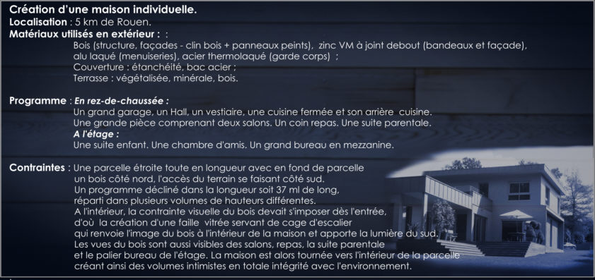 ; aménagements de dressing Cahier des charges Localisation : 5 km de Rouen Matériaux utilisés : bois (structure, façade, couverture, terrasse, menuiserie façade), zinc VM Quartz à joint debout (corniche, bandeau), alu laqué (menuiserie), acier thermo laqué (escalier intérieur), carrelage ; Contraintes