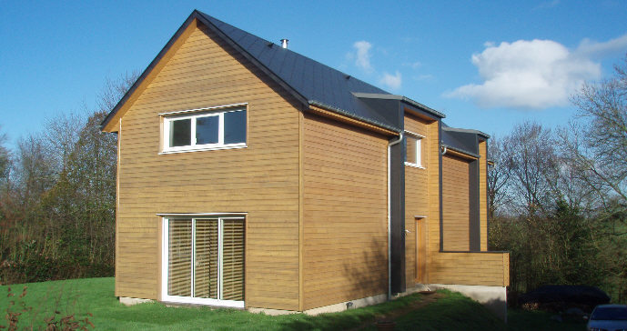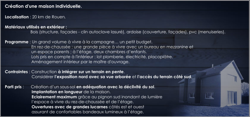 d’une maison familiale située à la campagne aménagement intérieur par le maître d’ouvrage Cahier des charges Localisation : 20 km de Rouen Matériaux utilisés : bois (élévation des murs, façade), ardoise (couverture et façade), pvc (menuiserie), lot électricité chauffage, lot plomberie. Contraintes