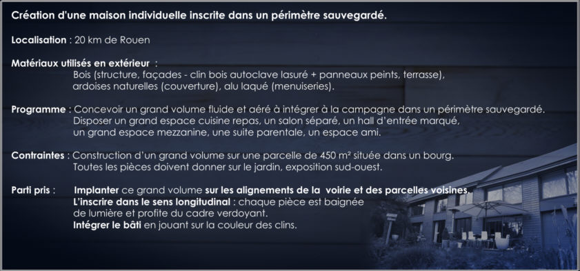 sauvegardé. Aménagements de placards et dressing Polychromie intérieure et ensemble des murs intérieurs peints. Cahier des charges Localisation : 20 km de Rouen Matériaux utilisés : bois (élévation murs et terrasse), clin bois lasuré et panneaux bois (façade) ardoises naturelles (couverture), alu laqué (menuiserie), carrelage, parquet, salle de bains, peinture (murs intérieurs). Programme