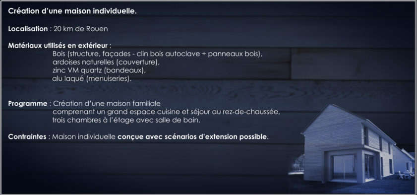 d’une maison individuelle Aménagement intérieur par le Maître d’ouvrage Cahier des charges Localisation : 20 km de Rouen Matériaux utilisés : bois (élévation des murs, terrasse), clin bois naturel et panneaux bois peints (façade), ardoises naturelles (couverture), alu laqué (menuiserie), zinc VM quartz (habillage façade), isolation doublage, carrelage. Programme