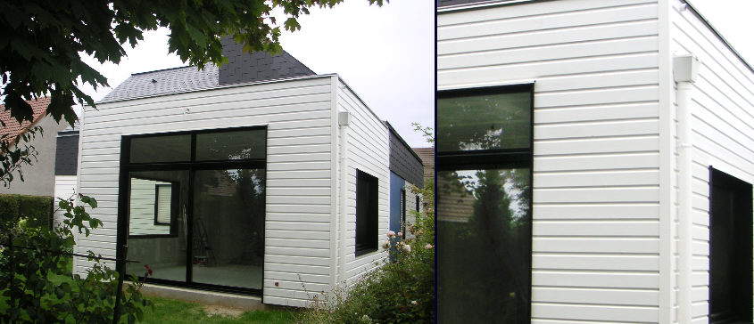 | Création d’un volume compact en ossature bois, aux lignes simples et géométriques, bénéficiant d’un maximum d’ouvertures sur le jardin. |