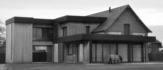 en bois avec toit plat. Module jouant sur les pleins & les vides, la redondance des ouvertures : larges baies courant à l’étage sur passage ouvert entre deux volumes verticaux. |