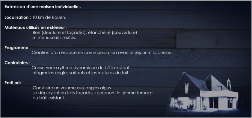 utilisés : bois (élévation murs), étanchéité (couverture), Programme : Création d’un espace en communication avec le séjour et la cuisine. Contraintes : Conserver