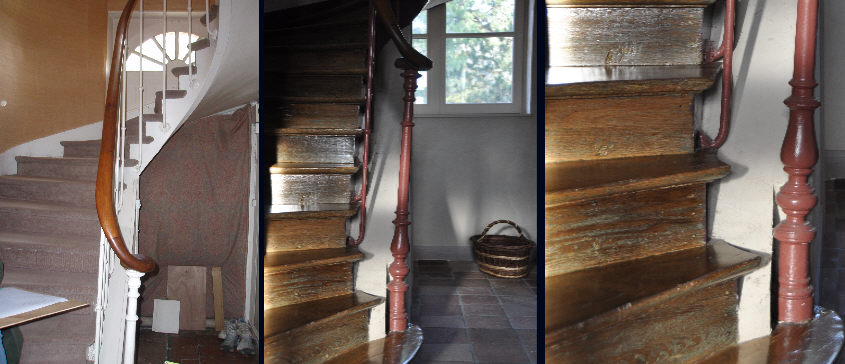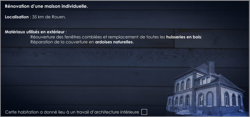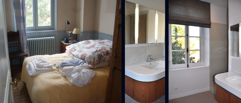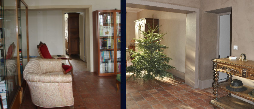 de la couverture. Réfection intérieure : sol (récupération et pose de tomettes anciennes, pose de carrelage, parquet et revêtement de sol souple) ; Remise aux normes de l’installation électrique ; Rénovation de la plomberie sanitaire ; Vitrification des parquets et de l’escalier Aménagement intérieur : création d’une entrée vestiaire et toilettes, d’un espace cuisine-repas, d’un salon et d’une bibliothèque, d’une suite parentale et d’une suite amis, de deux chambres d’enfants, d’un espace multimédia. Installation : isolation thermique et phonique ; sonorisation Décoration : peintures intérieures et extérieures et polychromie intérieure ; pose de doubles rideaux stores. Création de meubles Contraintes : Rompre et réorganiser